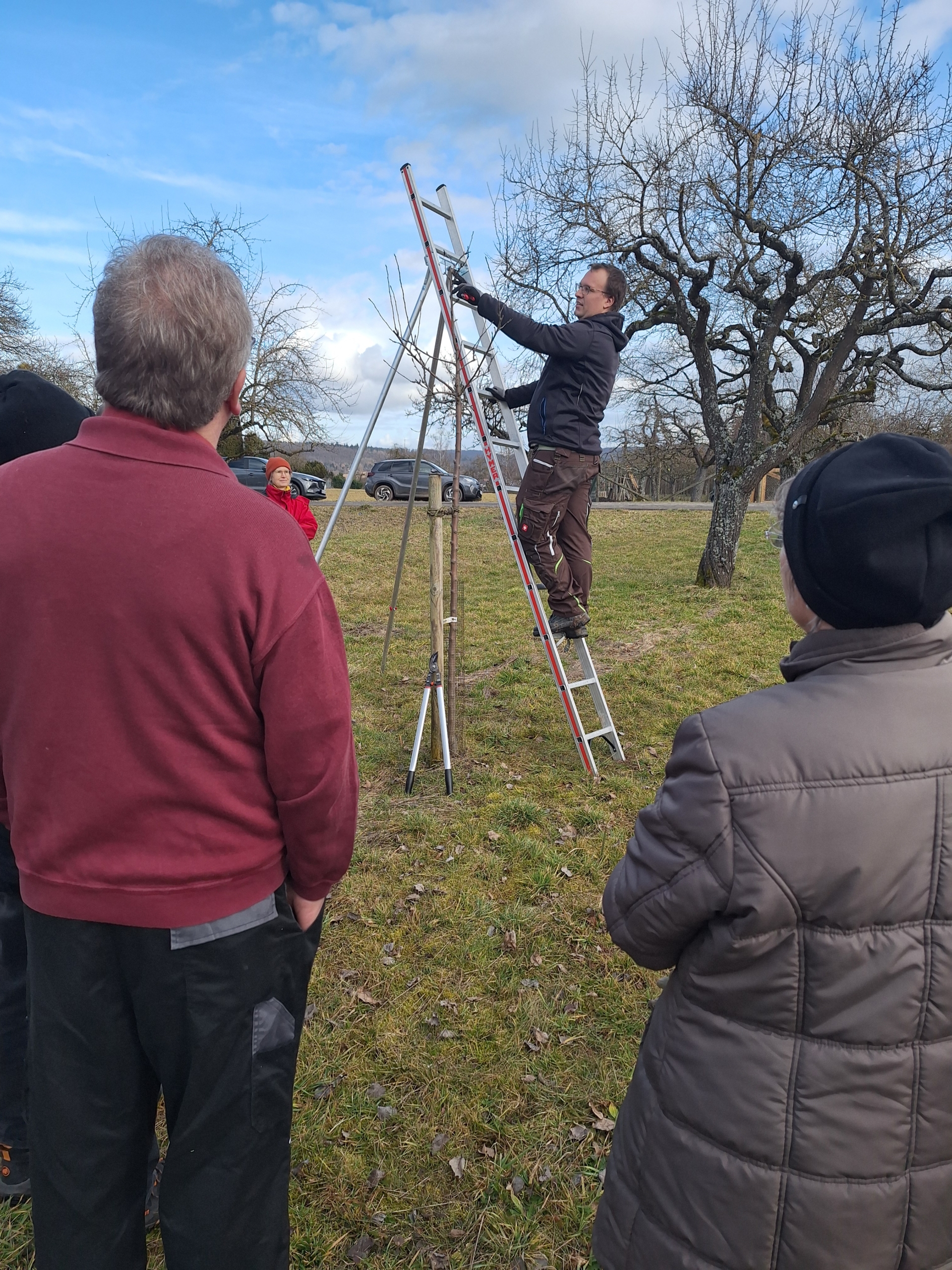 Eine Person steht auf der Leiter und schneidet einen jungen Obstbaum, andere Personen sehen zu